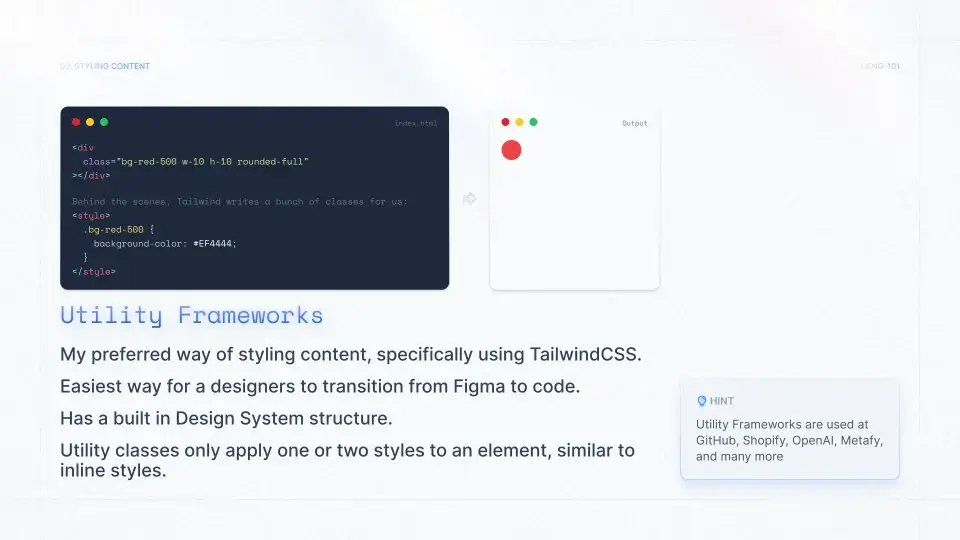 “This course has been a game changer, it gave me the confidence to build a couple new templates at work, and send my files to my senior engineer. He loved that I was able to write Tailwind and gave me access to our GitLab to contribute.”